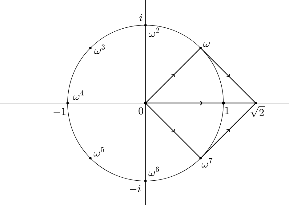 We can construct the sum ω_8 + ω_8^7 by adding vectors. Pythagoras theorem shows it is \sqrt{2}. This procedure generalizes this to n-roots with ω_n + ω_n^{n-1}, where the angles between roots are \frac{2⋅π}{n}. A bit of trigonometry shows the solutions