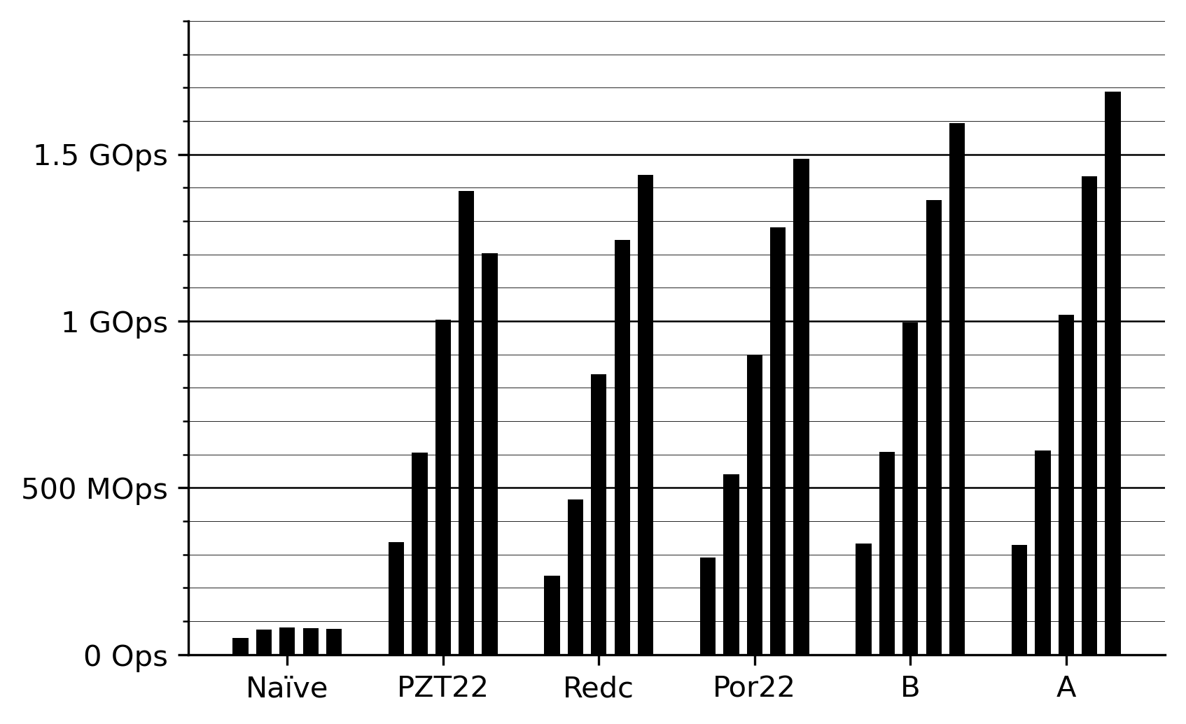 The benchmark measures the number of multiply-reduce operations-per-second (Ops) on a single 3.2 GHz M1 Max Firestorm core with N-way instruction-level parallelism for N∈\set{1,2,4,8,16}. The measured code is